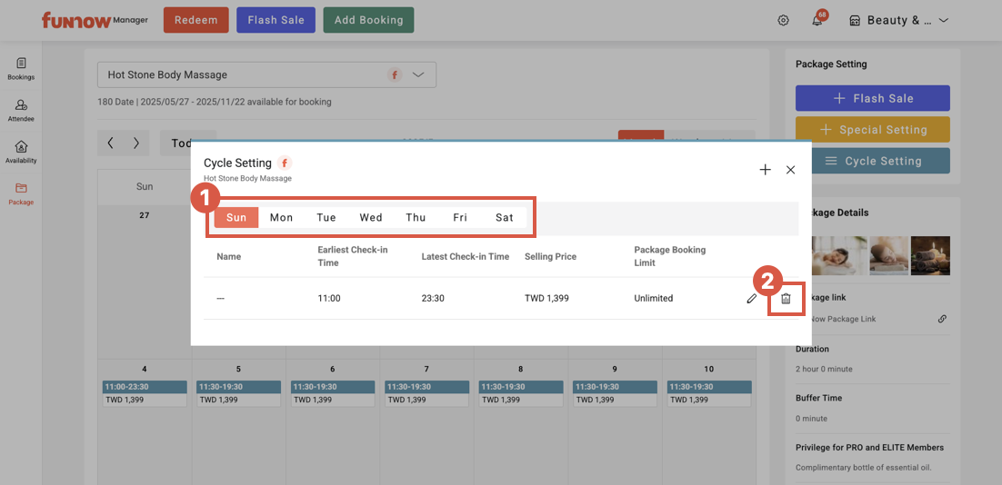 2. Click the “Cycle Setting” button to remove the booking time slots and prices for your selected package.