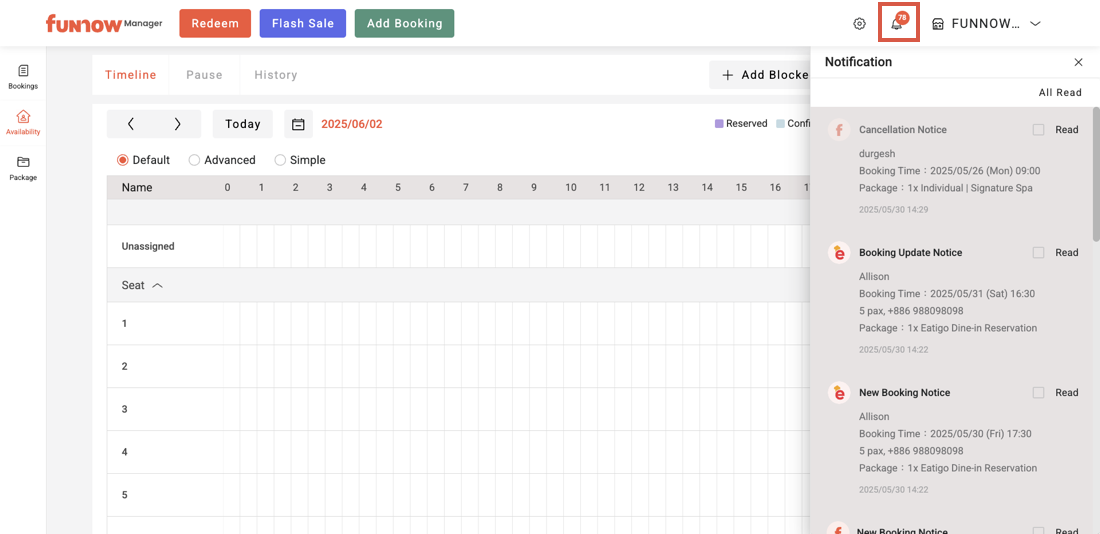 1. Click the bell icon at the top right corner to open the booking notification list.