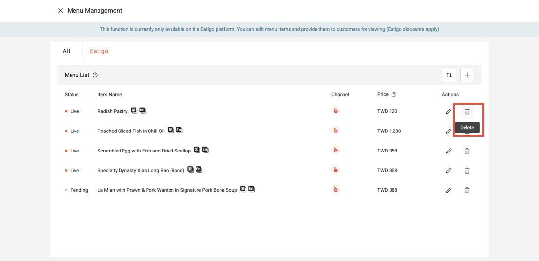 2. Click the trash can icon next to the item you wish to delete, then select “Confirm” to remove it.
