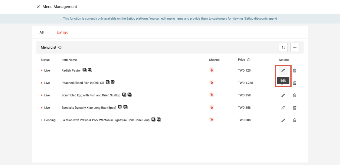 How to Edit Menu Items? February 10, 2026 03:33 Updated 1. Navigate to the Menu Management page.2. Click the pencil icon next to the item you want to edit. An edit window will appear. 3. After finishing the edits, click “Save” to apply all changes. Related articles How to Update Your Eatigo Yield Calendar? How to Block Unavailable Availability to Prevent Bookings? How to Add Menu Items? How can I quickly access the menu list? How to Order Menu Items?