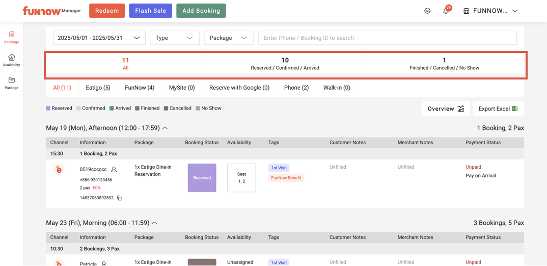 Please note: All filter conditions (such as search bar, booking status, etc.) only apply to bookings within the selected date range.