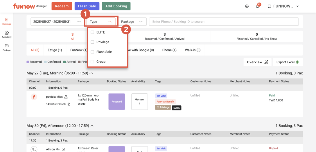 2. Type: Use this filter to quickly find bookings that include specific promotions or membership tiers.