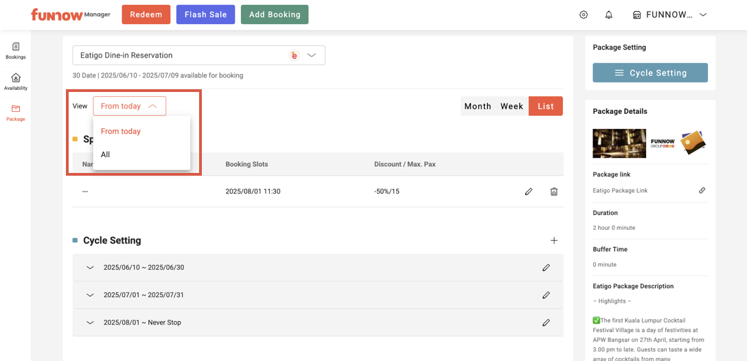1. Click "Package list" at the top left of the "Package" page to select the package you want to adjust.