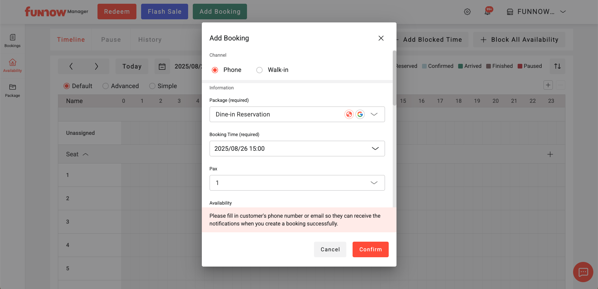 When a customer doesn’t book through your MySite booking link, you can use the “Add Booking” feature to manually create reservations from other channels (e.g., phone or walk-in) in the FunNow Manager system. This allows you to manage all bookings in one place.