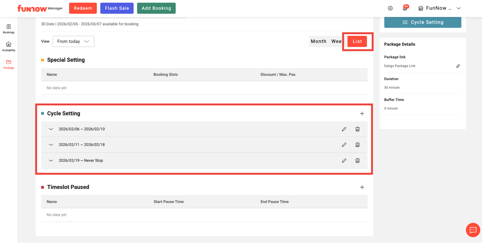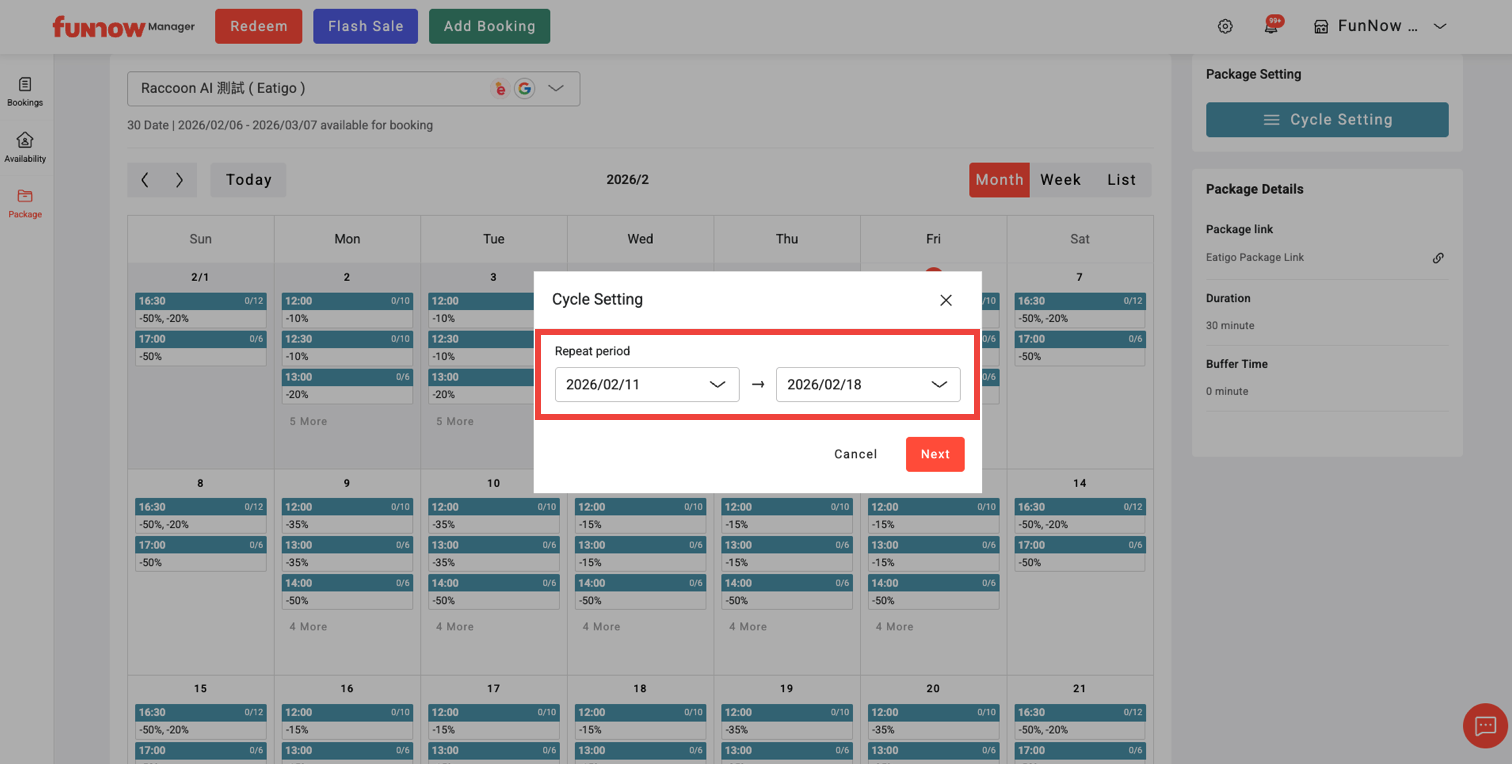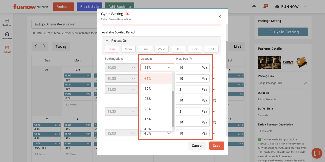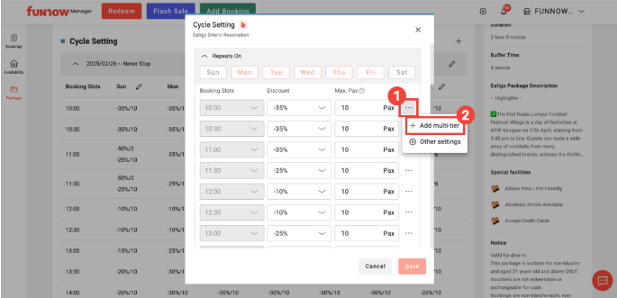 2. Click the “Cycle Setting” button to adjust the discount and maximum pax for each booking time slots.