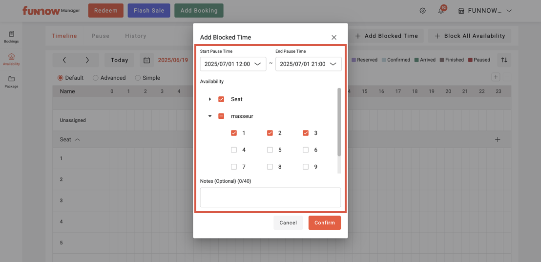 - Notes: This optional field allows you to provide additional details about the reason for blocking availability or any other related information.