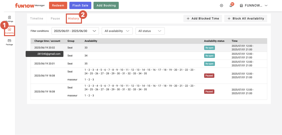 Click the “History” tab in the upper left corner of the “Availability” page to view the block status, modification time, and operating account for all availabilities.
