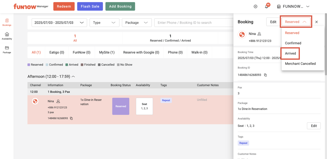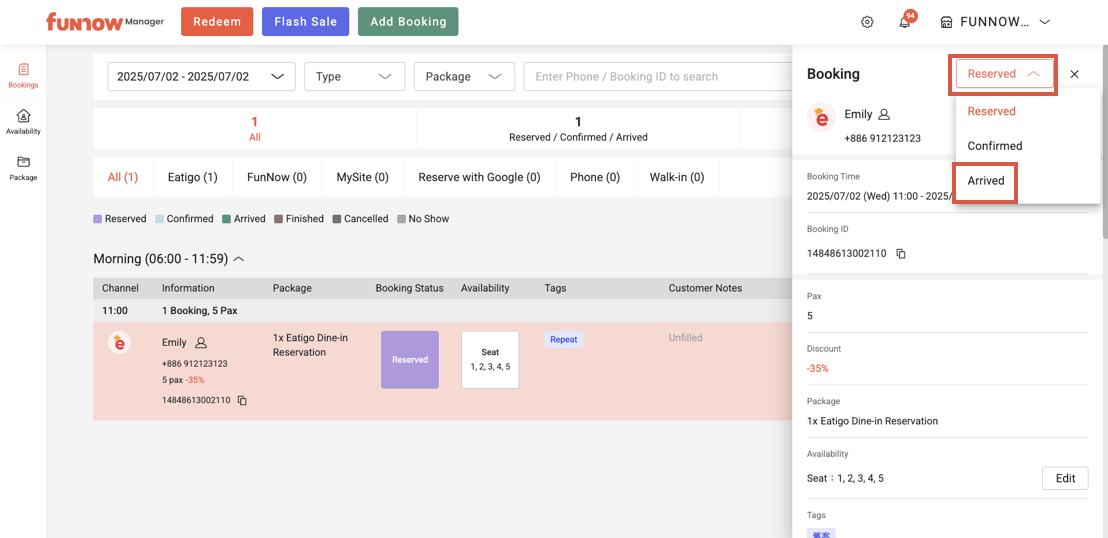 2. Click “Booking Status” at the top right corner of the booking details, then select “Arrived” to complete the redemption.