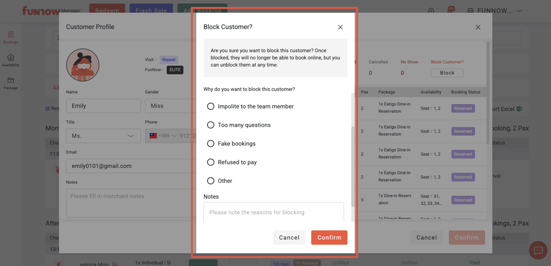 3. You can either select a default blocking reason provided by the system or manually enter the customer’s blocking reason in the Notes section. Once finished, click “Confirm” to save the blocking settings.