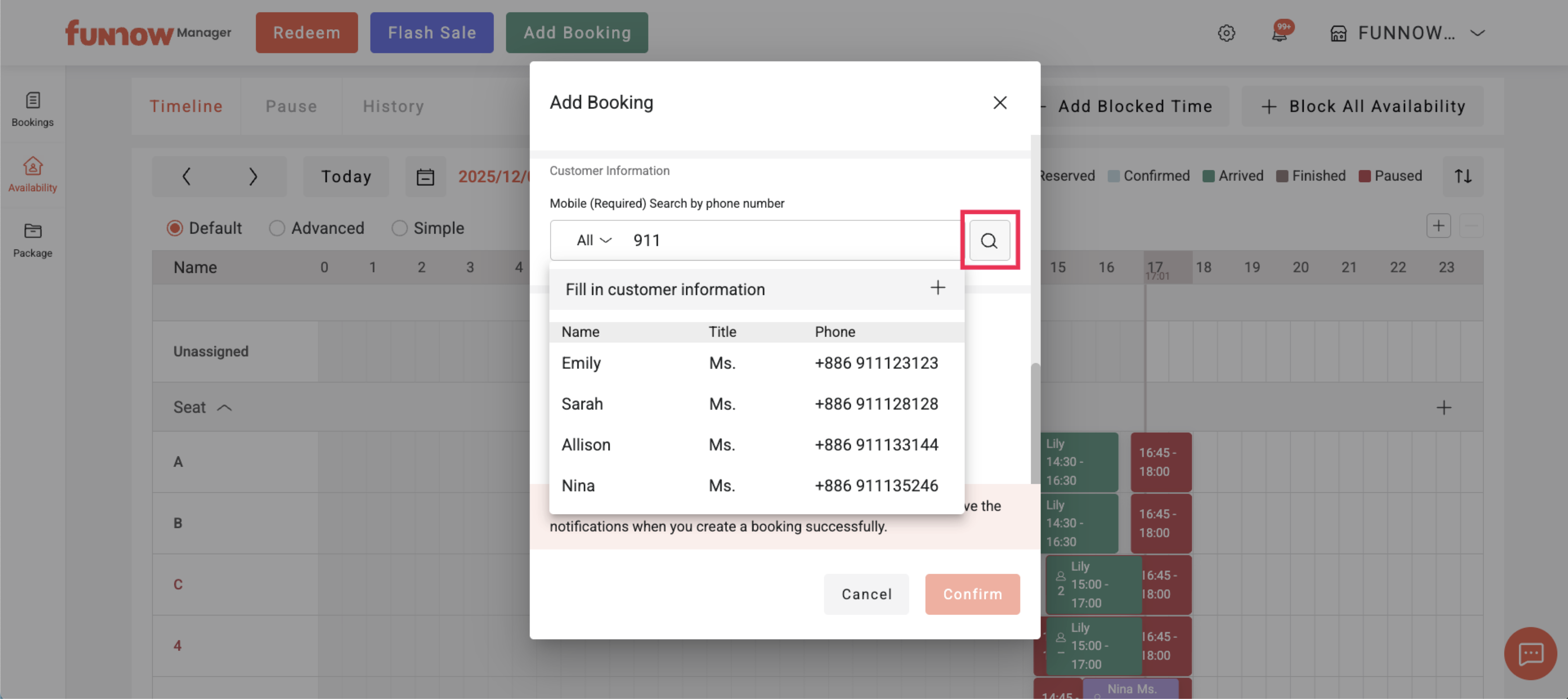 When creating a booking, simply enter a phone number to quickly retrieve existing customer information. The system will automatically populate commonly used fields, reducing repetitive input for merchants.