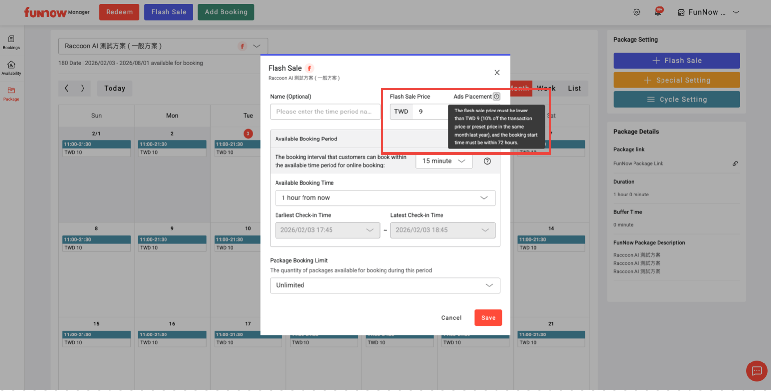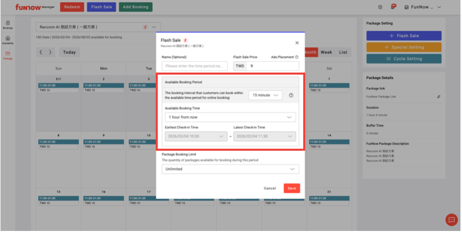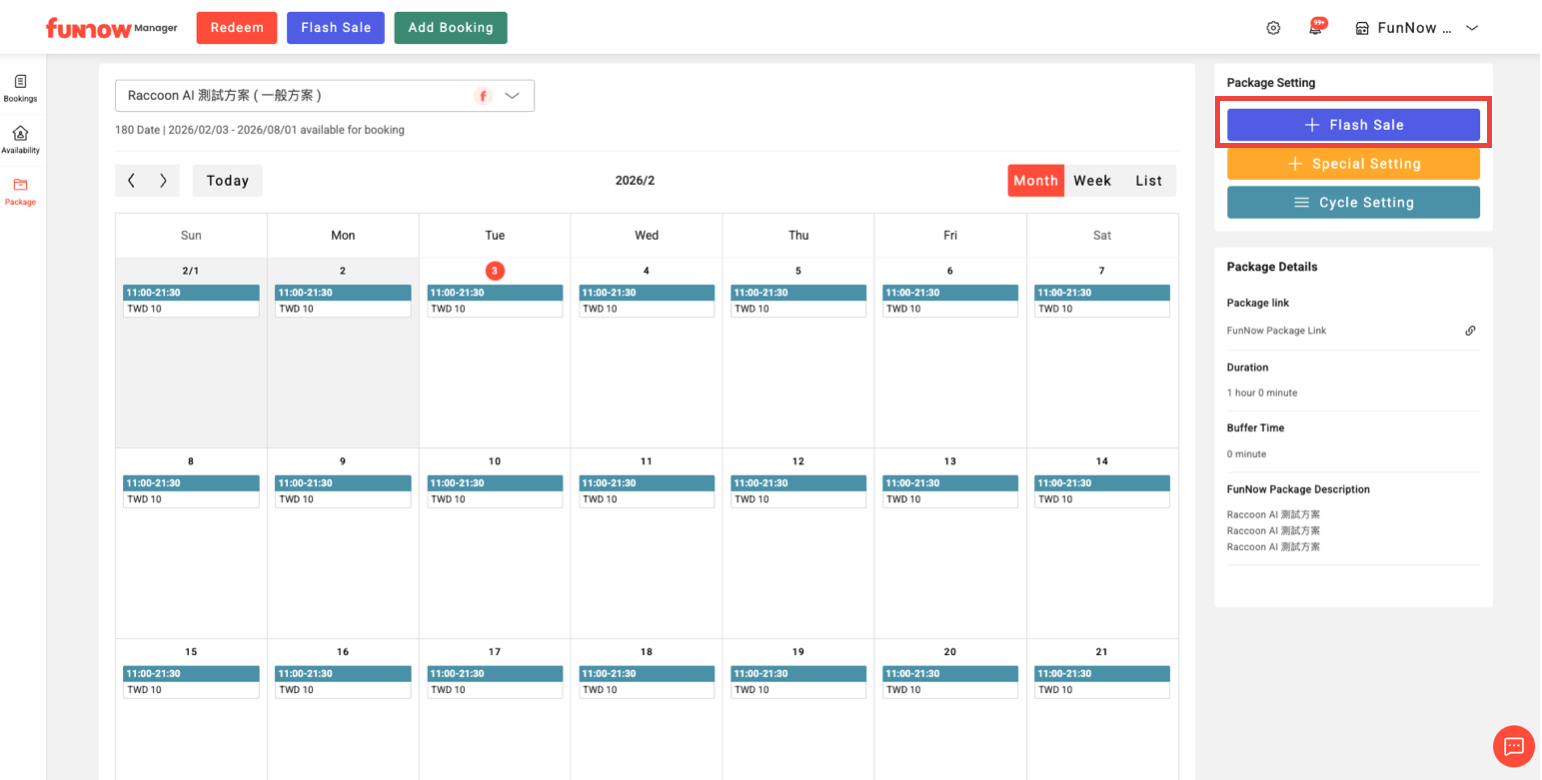 Note: Bookings from “special settings” during that period are included in the Flash Sale price calculation. Therefore, we do not recommend using special settings to lower package prices.