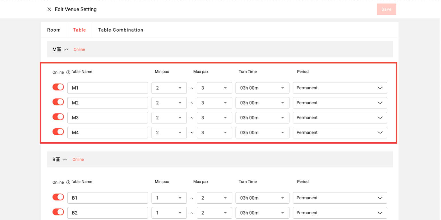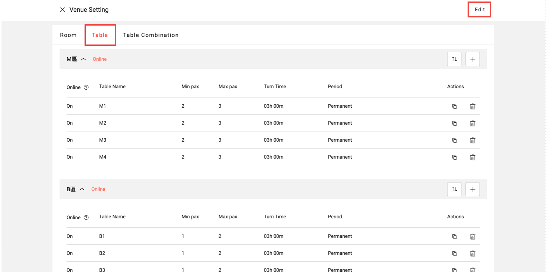 How to Edit a Table? February 09, 2026 07:06 Updated 1. Enter the "Availability" page and select "Venue Setting".2. Enter the "Table" section, and click "Edit" in the top-right corner.3. Adjust the specific conditions for tables Related articles How to Delete a Table?