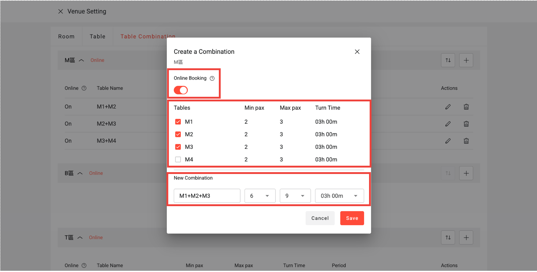 The system supports diverse table-combination settings. For example, you can create a combination for M1+M2, and another for M1+M2+M3. Even if a table is already part of another group, the system accepts any unique setting to maximize your seating options.