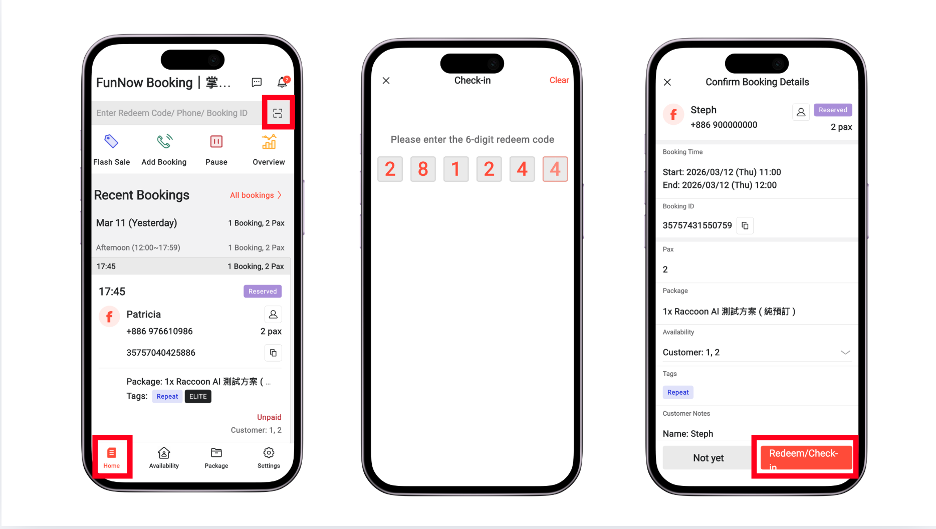 Once booking your product, customers will receive a 6-digit redeem code. Simply enter the code to redeem the reservation.
