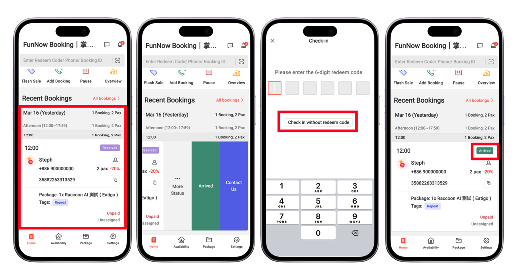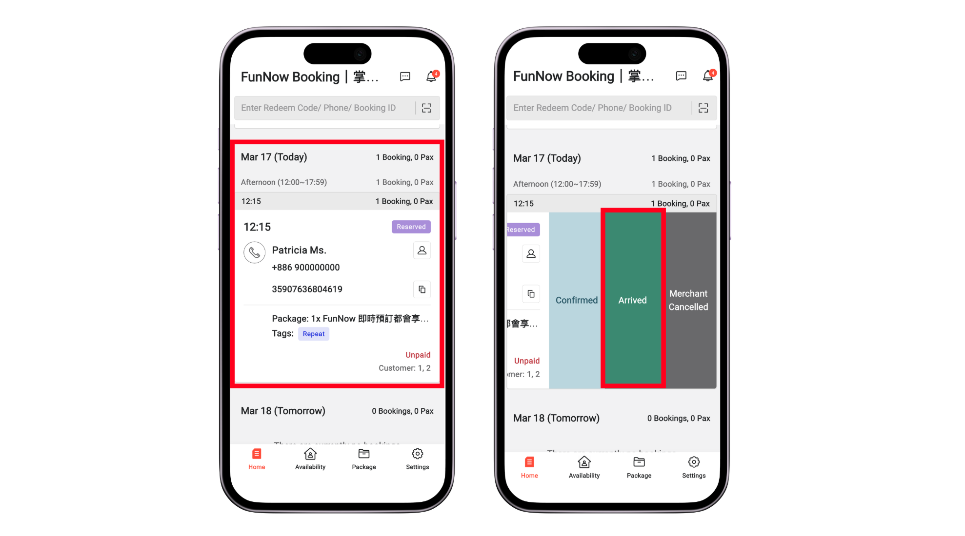 2. Swipe left on the order to reveal more status options, then click"Arrived" to complete the redemption.