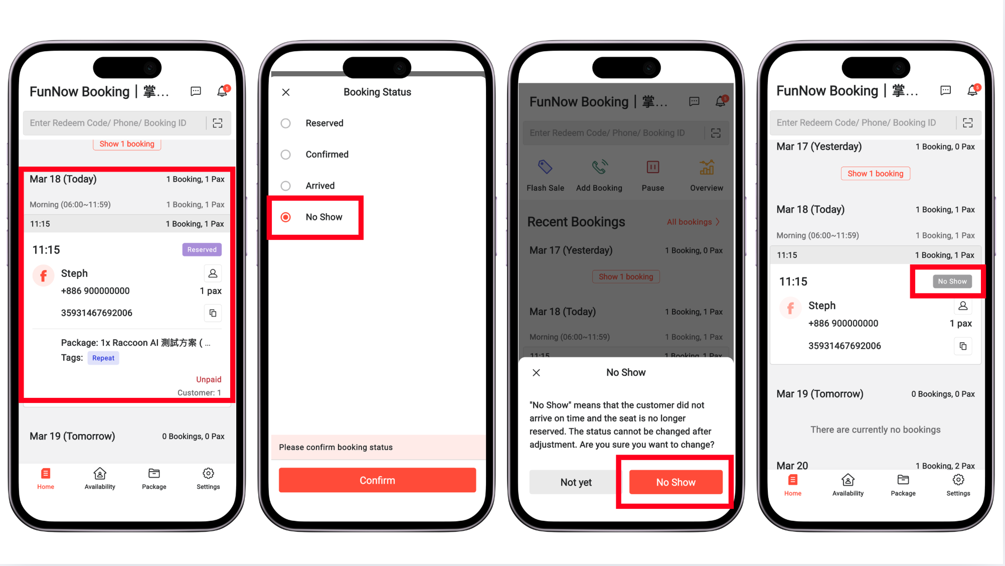- You can only mark a booking as “No-Show” when its status is either “Not Arrived” or “Confirmed”.