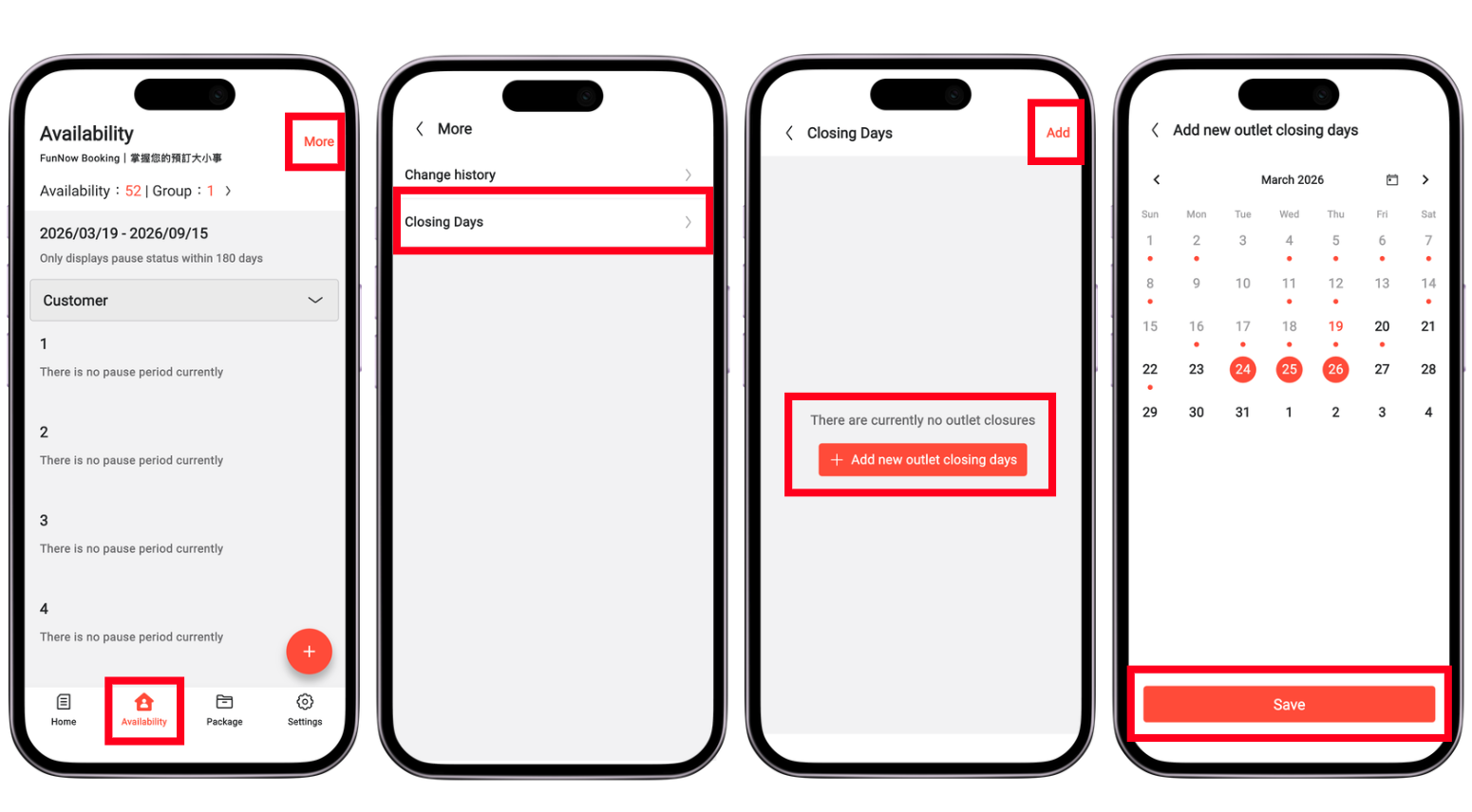 Select "Closing days", and then you can either click "Add" or "+ Add new outlet closing days".
