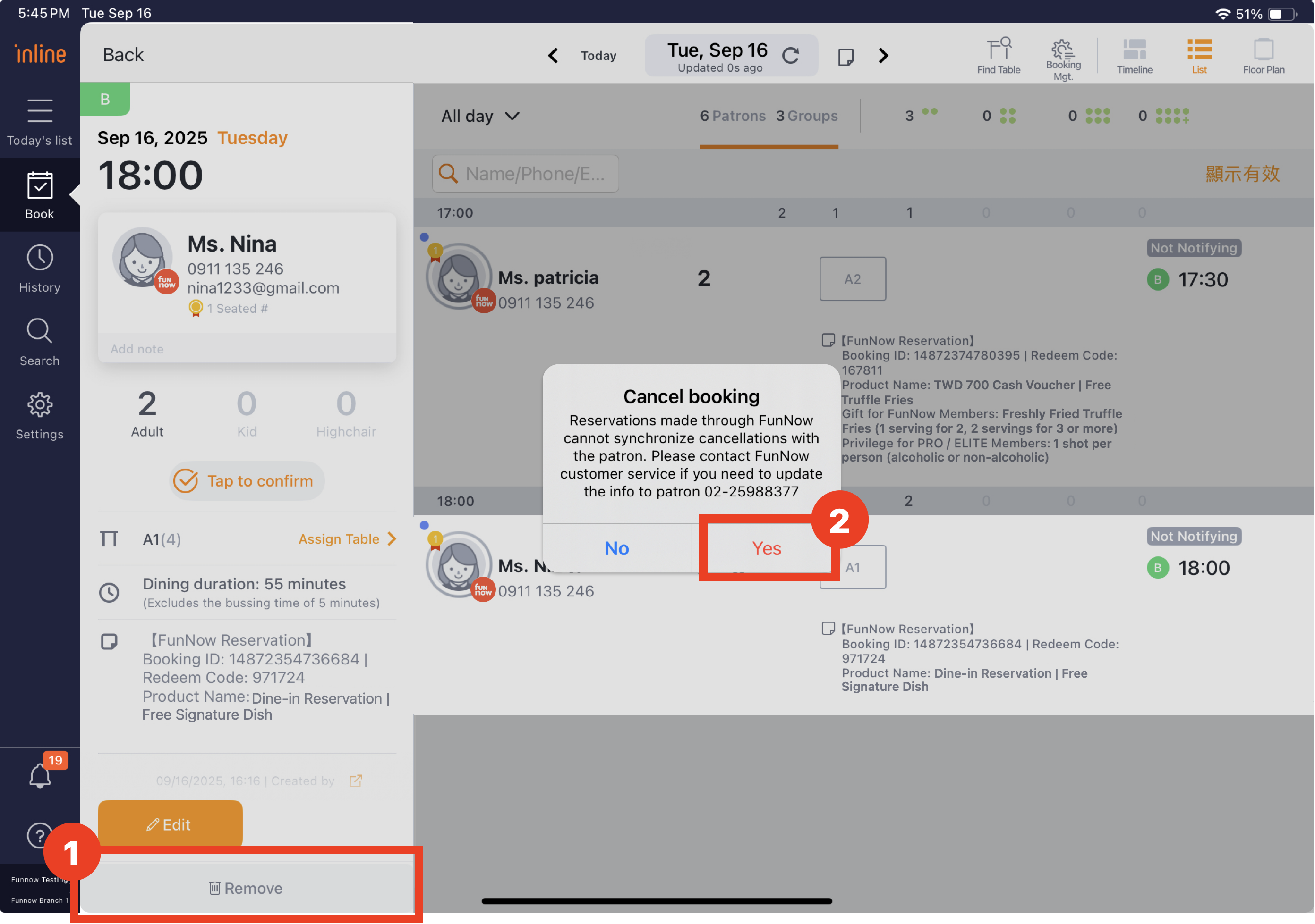 If you need to cancel a customer’s booking due to force majeure, or if the customer is unable to arrive for any reason, you can use the "Remove" function to cancel the booking.