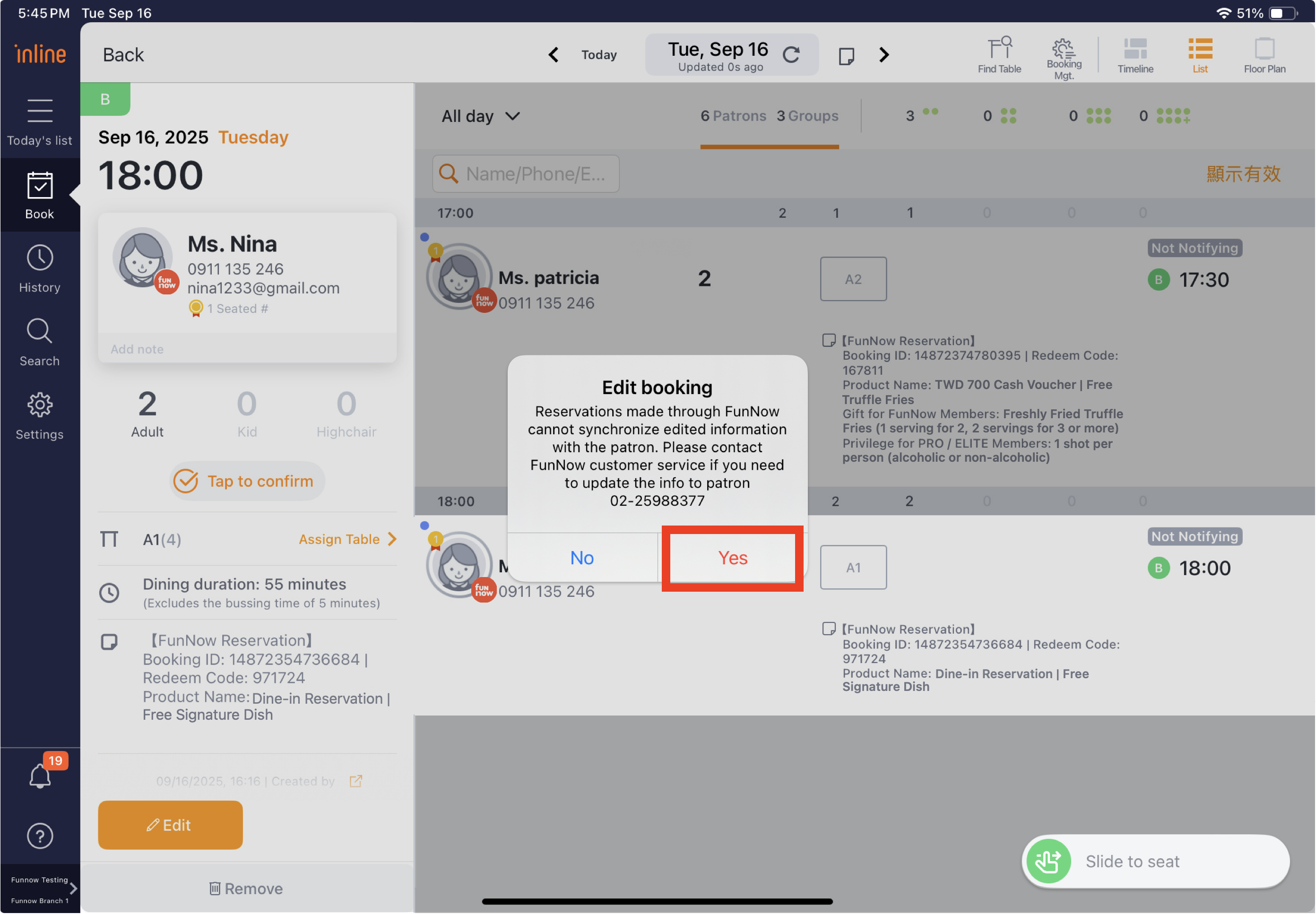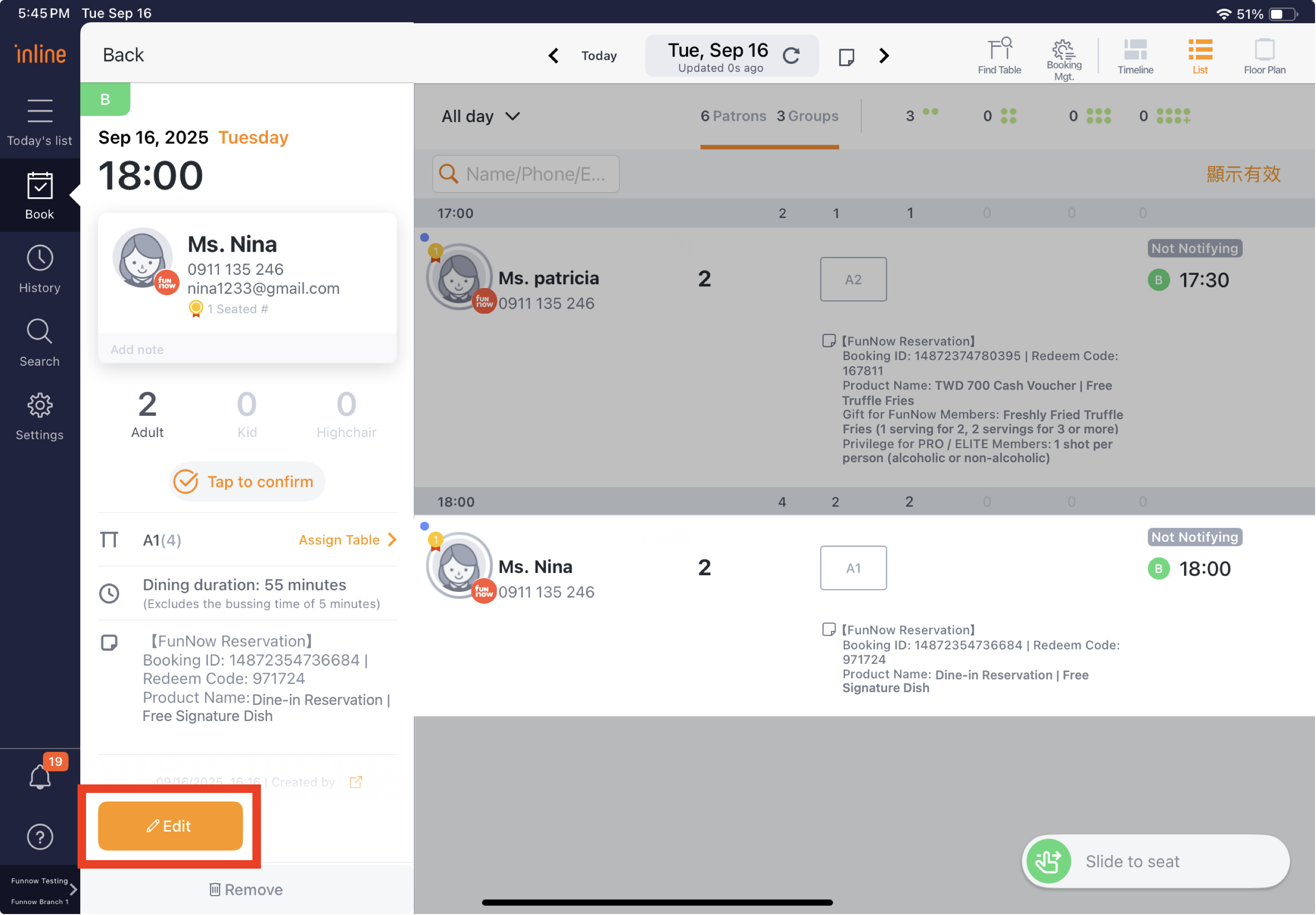 If you need to change a customer’s booking time due to force majeure, or if the customer is unable to arrive for any reason, you can use the "Edit" function to adjust the booking time.