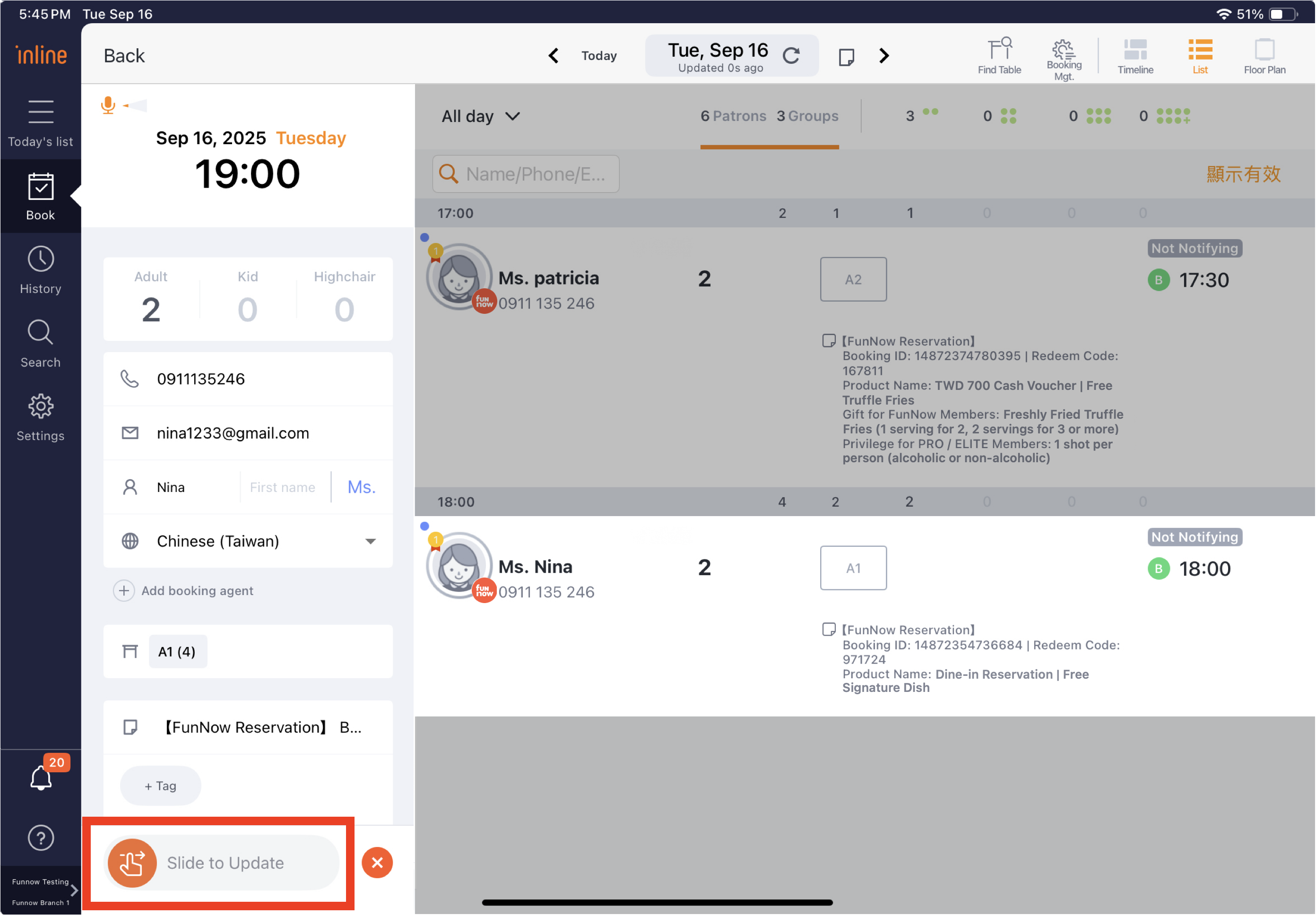 5. After making the changes, slide the "Silde to seat" button at the bottom of the booking details page to apply the updates.