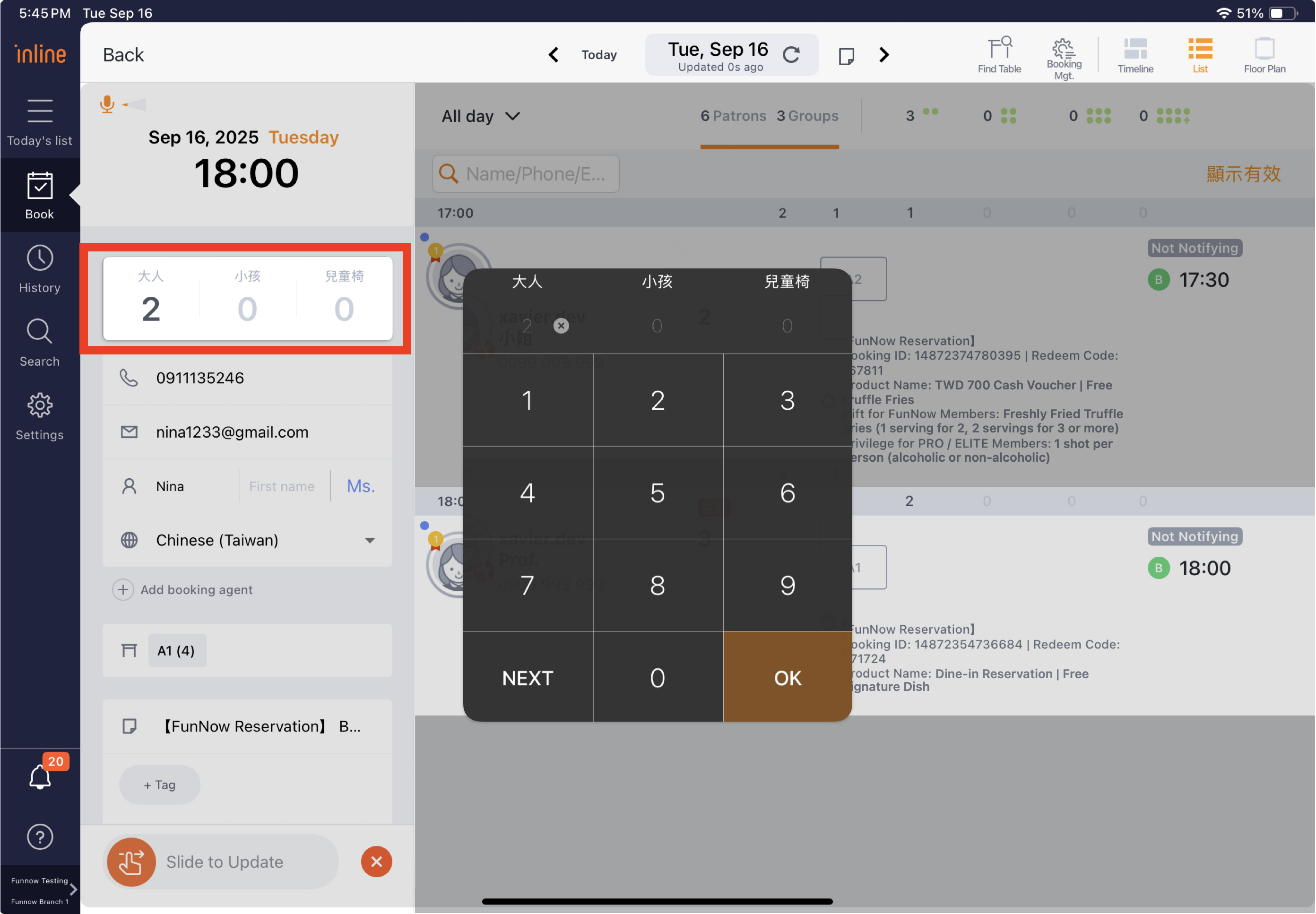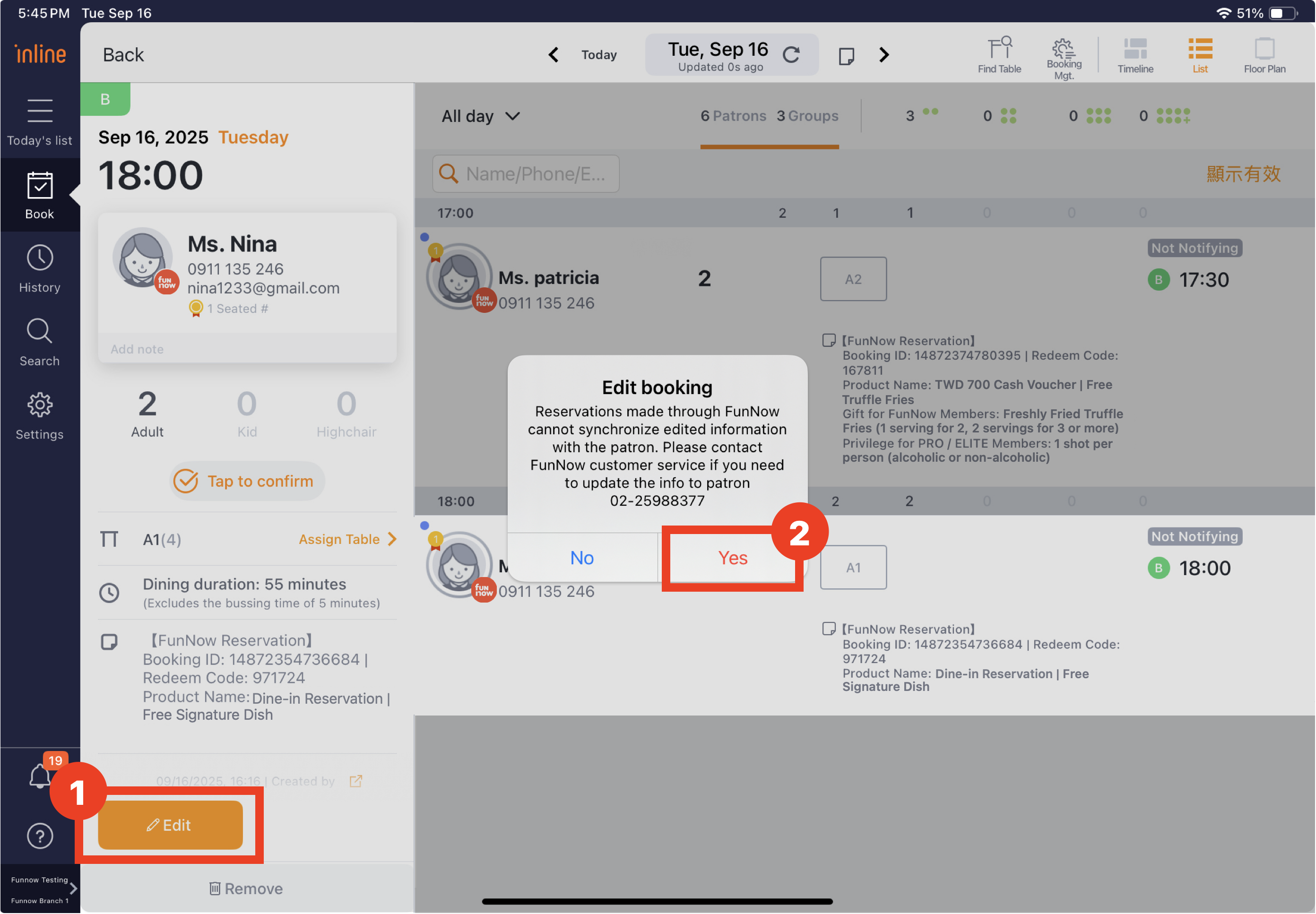 If the actual number of customers arriving at the branch differs from the booking, use the Edit function to update and record the actual number of guests.