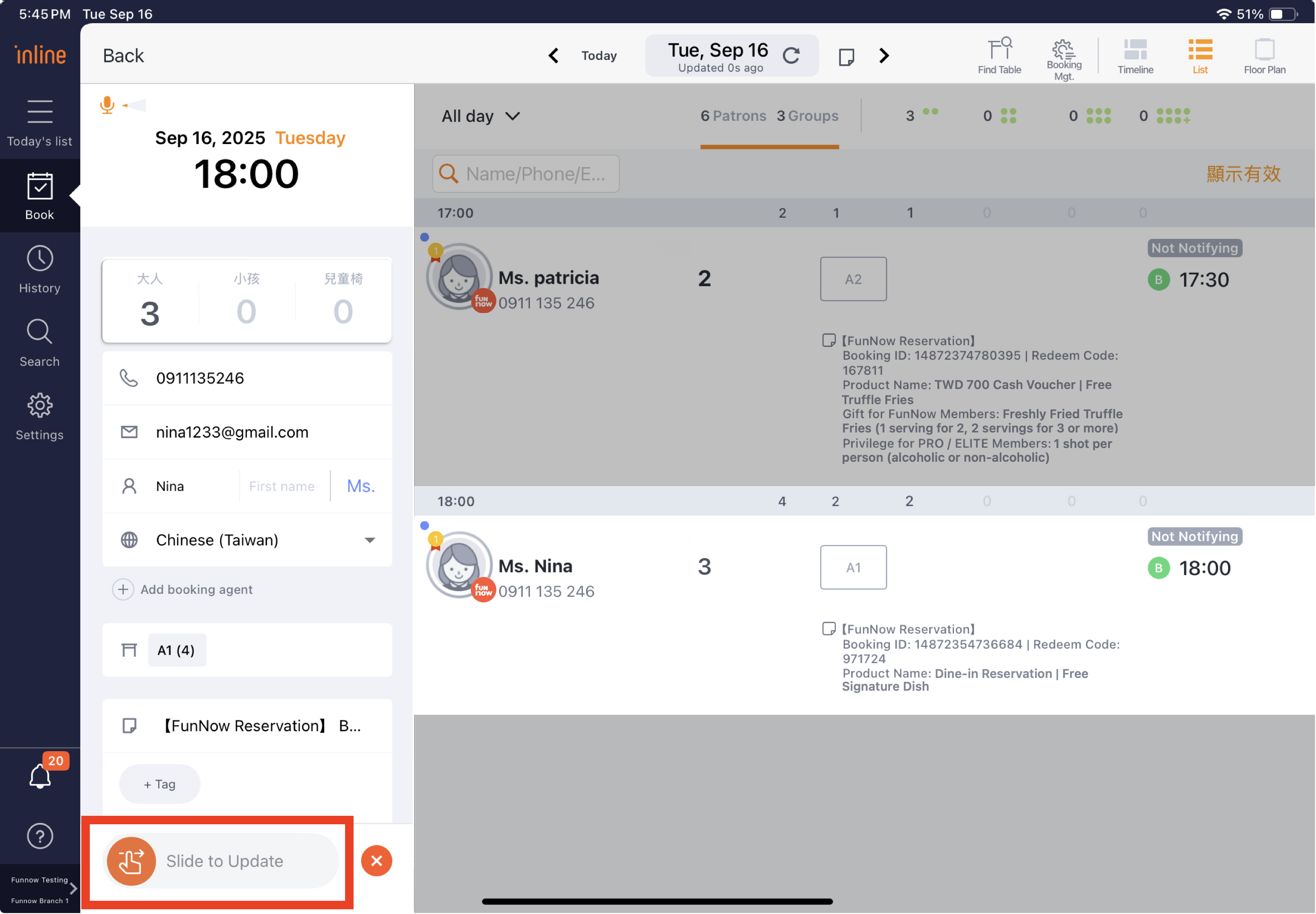 5. After making the changes, slide the "Silde to seat" button at the bottom of the booking details page to apply the updates.