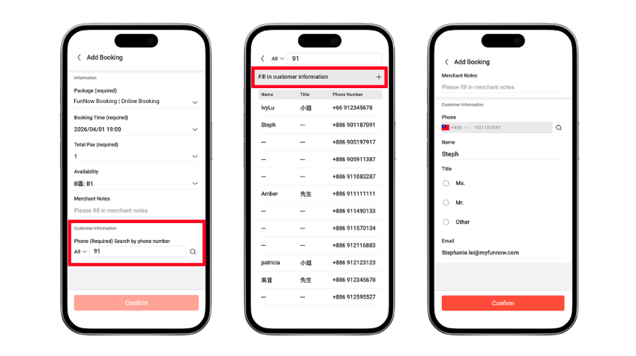 - If no records are found for that phone number, you can click "Fill in Customer Information" to create a new profile for this booking.