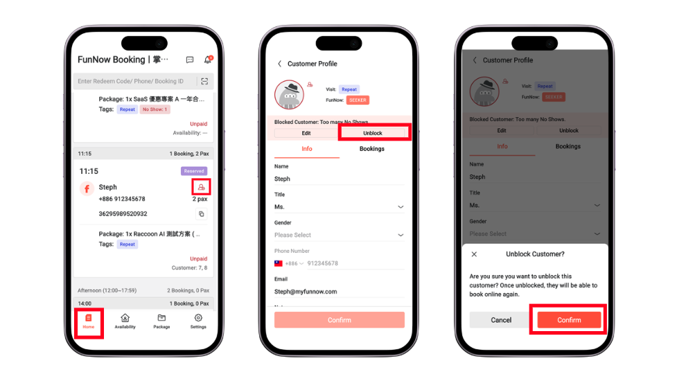 How to Unblock a Customer? April 02, 2026 04:14 Updated 1. Navigate to the "Home" page, and click the profile icon on the booking to open the customer profile.2. Click the "Unblock" button.3. Click “Confirm” to save the unblock settings. Related articles How to Reassign an Availability for a Booking? How to Add a Customer to the Blacklist?