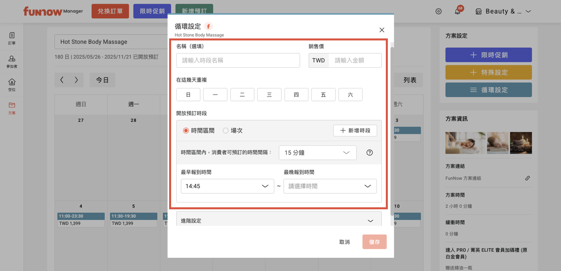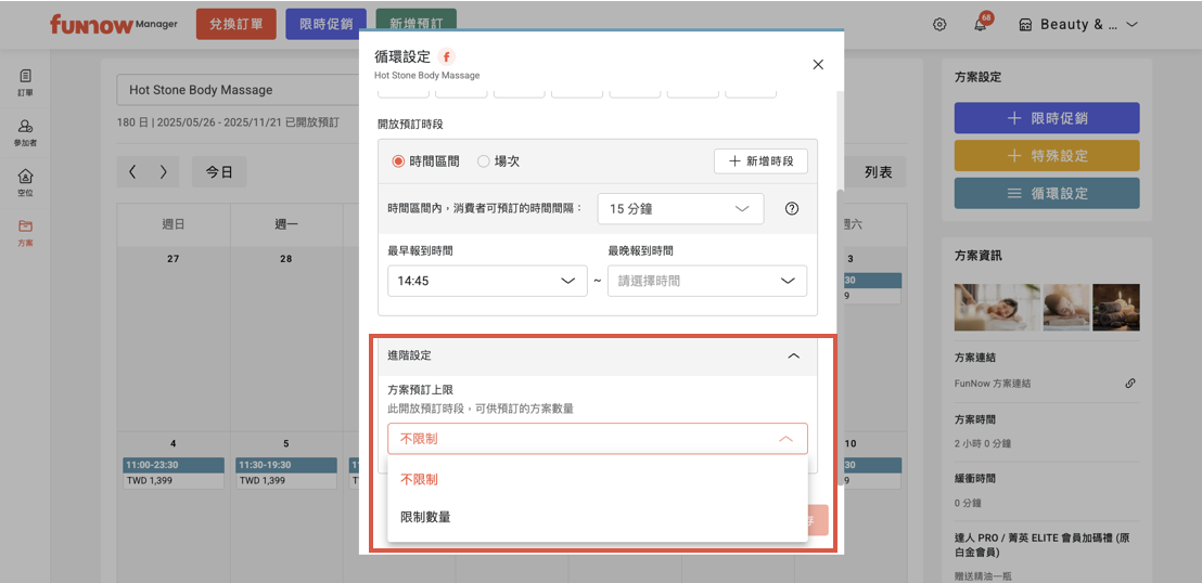 5. 在進階設定中可以設定此時段的「方案預訂上限」。此設定可用於限制在該時段與價格條件下可接受的預訂方案數量。若無需限制,系統將預設為「不限制」。