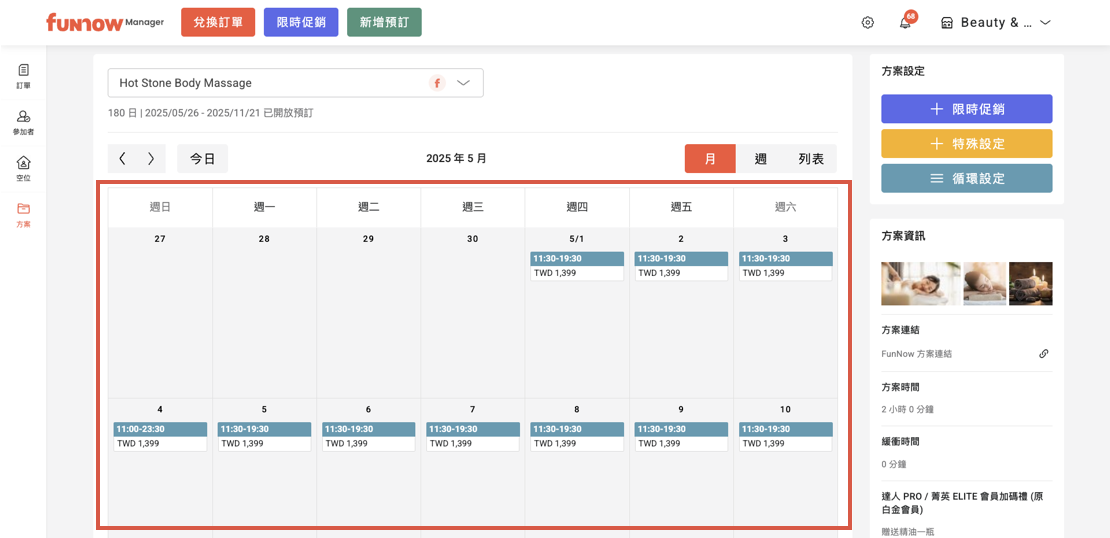 在這幾天重複:選擇您希望方案可以提供預約、販售的日期。一旦選擇完成,該方案將在每週相應的日期重複出現。