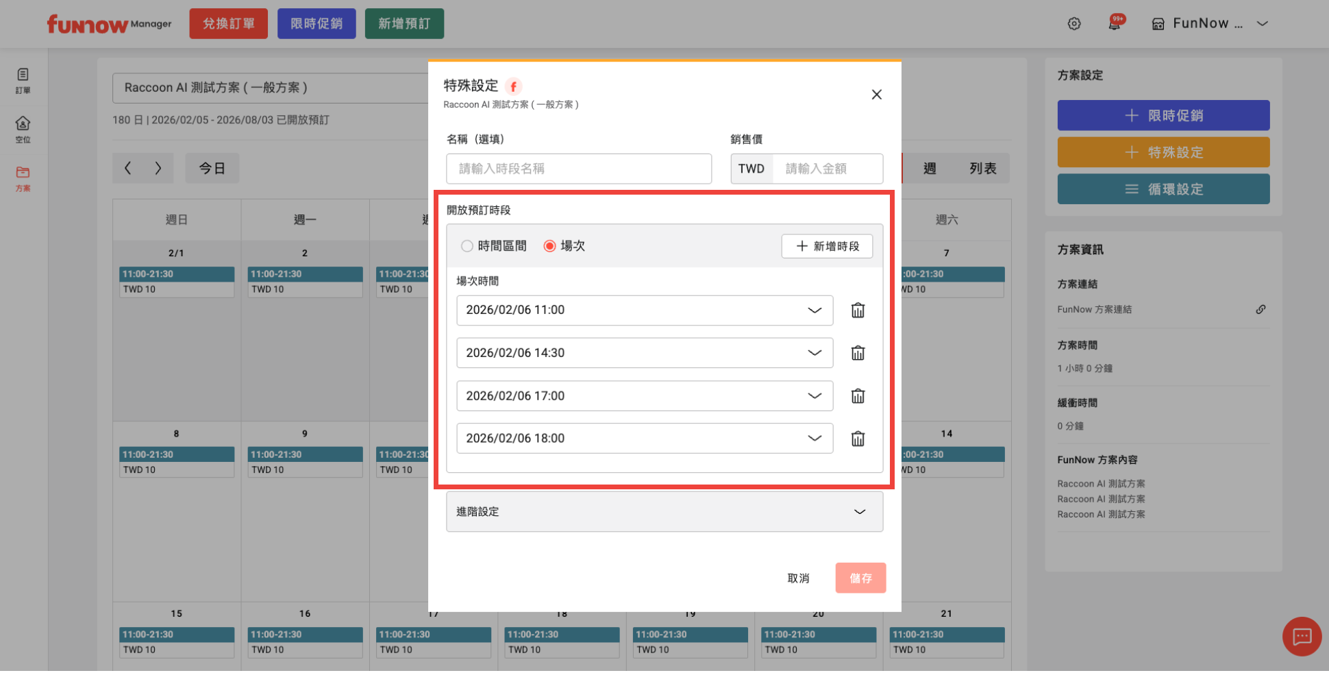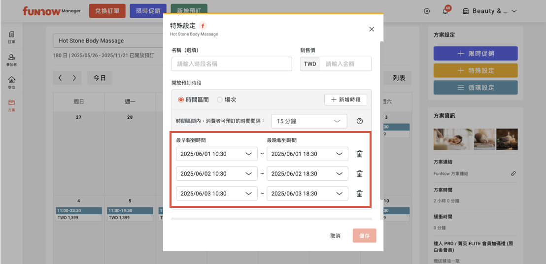 2. 有鑒於特殊設定價鉻將會納入系統「限時促銷價格」計算中,因此不建議您透過特殊設定降低方案售價 - 在「開放預訂時段」中,您可以選擇「時間區間」與「場次」擇一設定