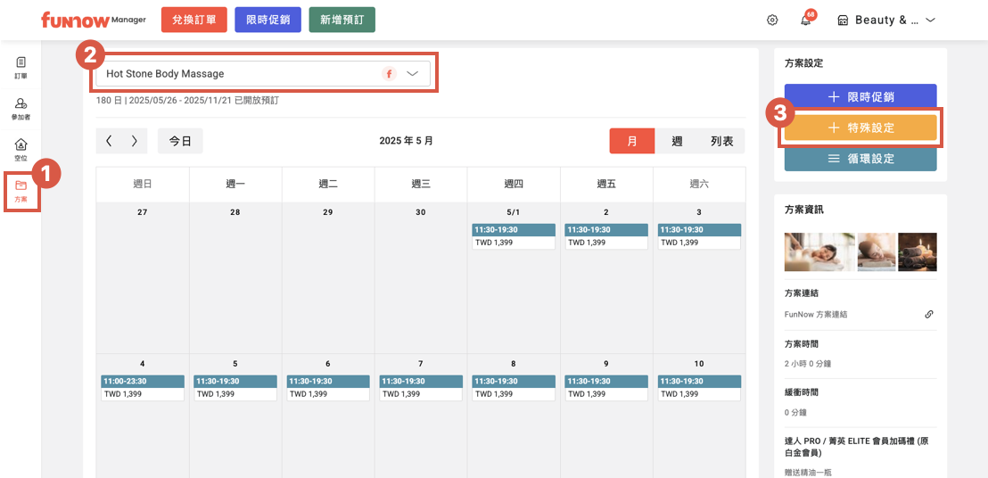 2. 點擊頁面右側「特殊設定」來為您選擇的方案設定預約 / 販售時段與價格