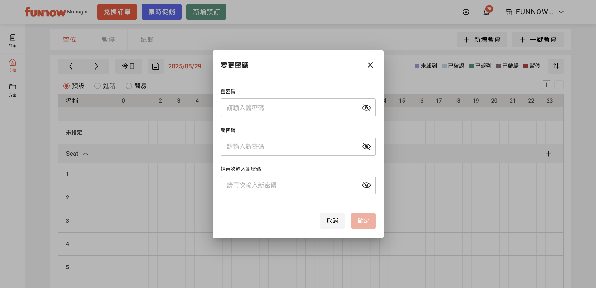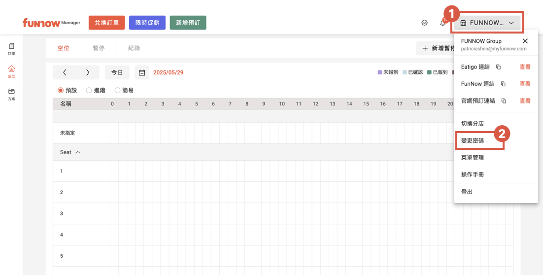 如何更改 FunNow Manager 登入密碼? 2025年05月29日 08:39 1. 點選右上角的分店名稱,開啟分店選單。 2. 點擊「變更密碼」 3. 依指示輸入舊密碼與新密碼,即可完成密碼變更 相關文章 如何登入 FunNow Manager? 忘記 FunNow Manager 登入密碼時,該如何重設? 無法提供預訂的空位該如何暫停? 如何新增菜單品項? 如何利用「循環設定」設定常態販售價格?