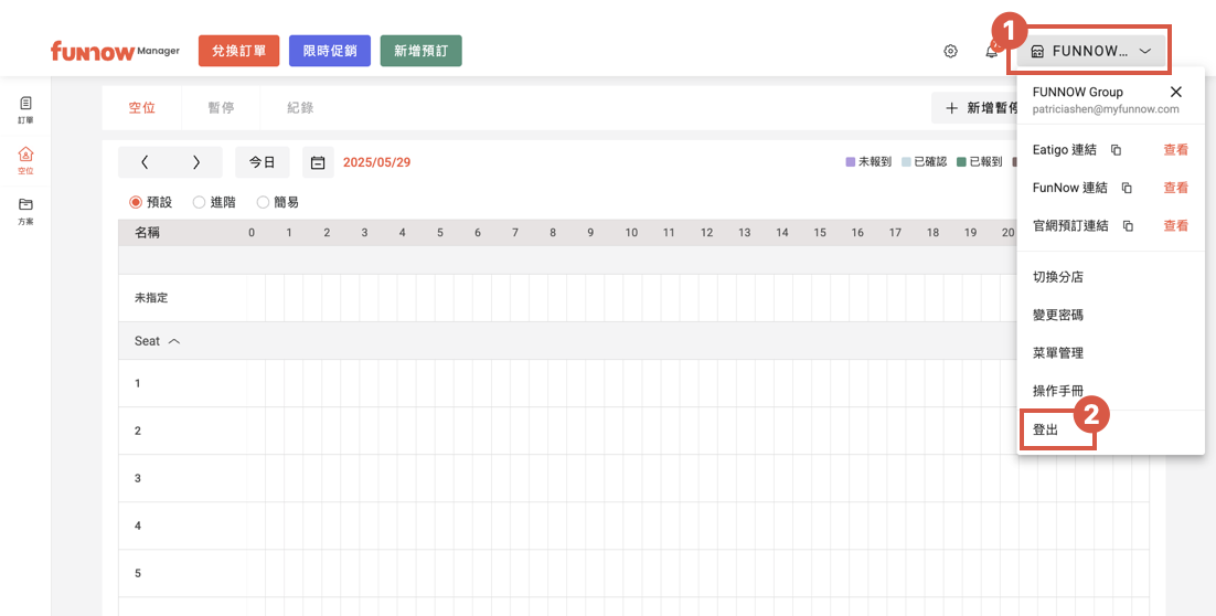 如何登出 FunNow Manager? 2025年05月29日 08:52 更新於 1. 點選右上角的分店名稱,開啟分店選單。 2. 點擊「登出」,即可成功退出帳號。 相關文章 如何快速進入菜單列表? 如何更改 FunNow Manager 介面語言? 忘記 FunNow Manager 登入密碼時,該如何重設?