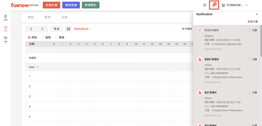 如何於 FunNow Manager 查看訂單通知? 2025年06月02日 06:17 更新於 1. 點選右上角的小鈴噹圖示以展開訂單通知列表 2. 您可以在列表中查看所有新訂單、訂單異動與取消訂單的通知 相關文章 如何啟用 FunNow Manager 通知? 我可以在串接系統上取消消費者訂單嗎? 如何新增菜單品項? 在顧客資料中可以查看哪些資訊? 如何匯出訂單?
