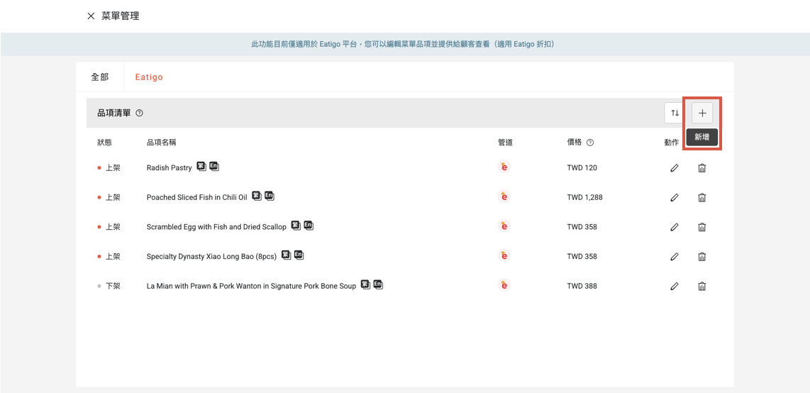 - 顯示管道:目前僅 Eatigo 平台支援菜單功能,預設顯示管道為 Eatigo