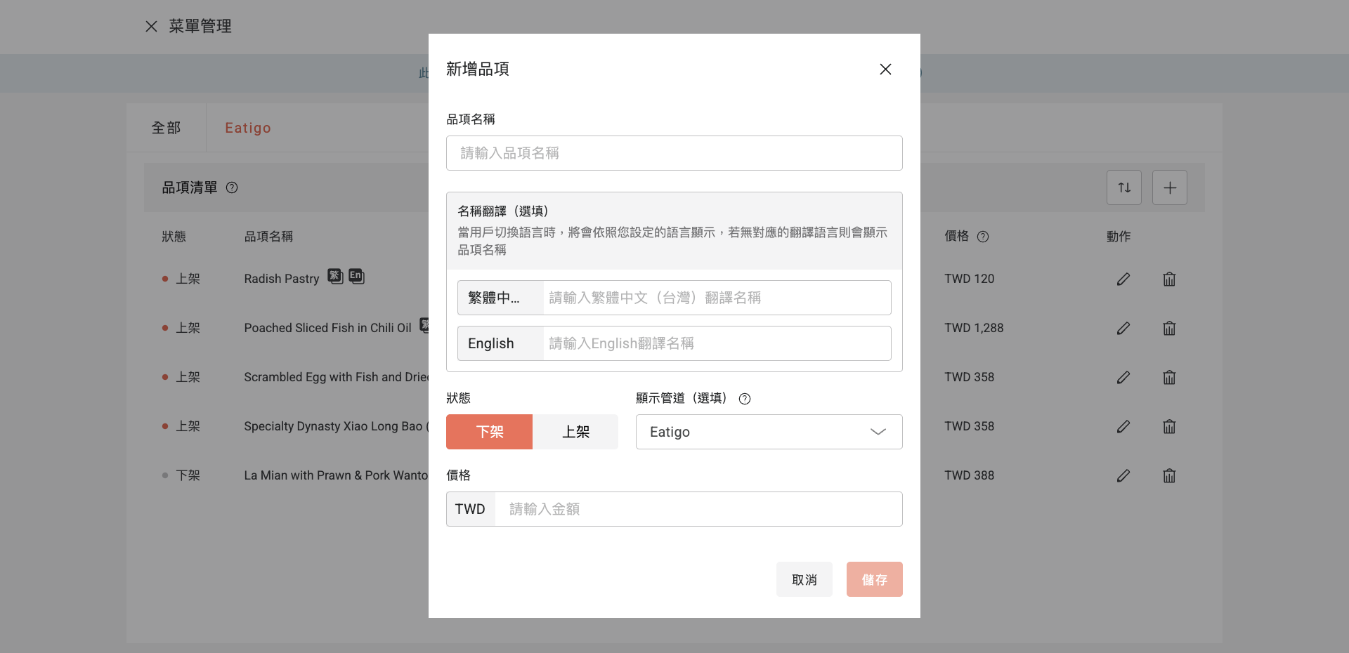 Eatigo 目前支援英文及當地主要語言(如:中文、泰文)介面。若您未填寫「名稱翻譯」,系統將在所有語系介面中,統一以「品項名稱」顯示。- 狀態: