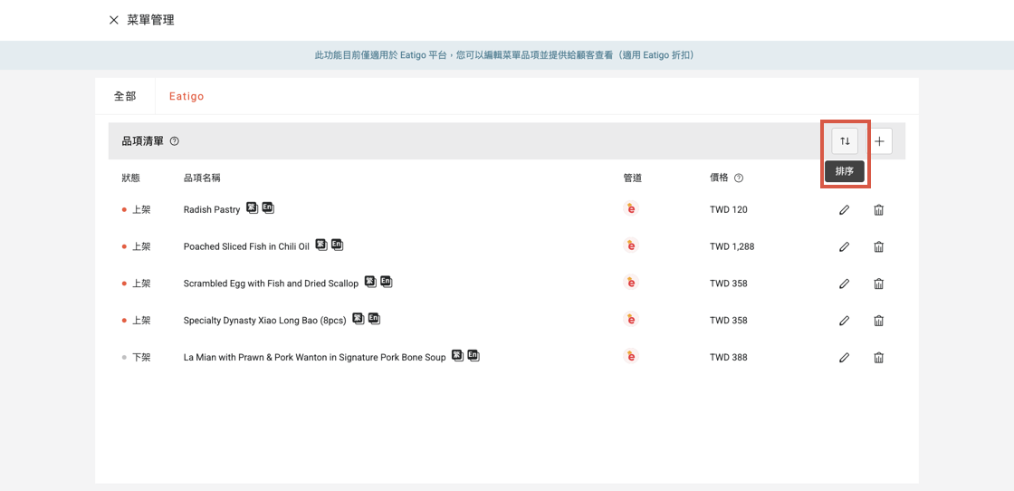 如何調整菜單品項順序? 2026年02月10日 03:48 更新於 1. 進入「菜單管理」頁面2. 點擊品項清單右側的「↑↓」圖示以調整排序 3. 您可以利用下列兩種方式來調整菜單品項排序點擊品項右側的「↑↓」箭頭,可逐項上移或下移,方便逐一調整品項順序按品項左側的「≡」圖示並拖曳至指定位置,適合快速大幅調整排序每個品項左側的圓點代表其上架狀態:橘色為上架中,灰色為下架中。只有橘色圓點(上架中)的品項,才會顯示在消費者的預訂頁面中。 相關文章 如何查看菜單品項上下架狀態? 如何刪除菜單品項? 如何查看菜單品項翻譯狀態? 如何快速進入菜單列表? 如何新增菜單品項?