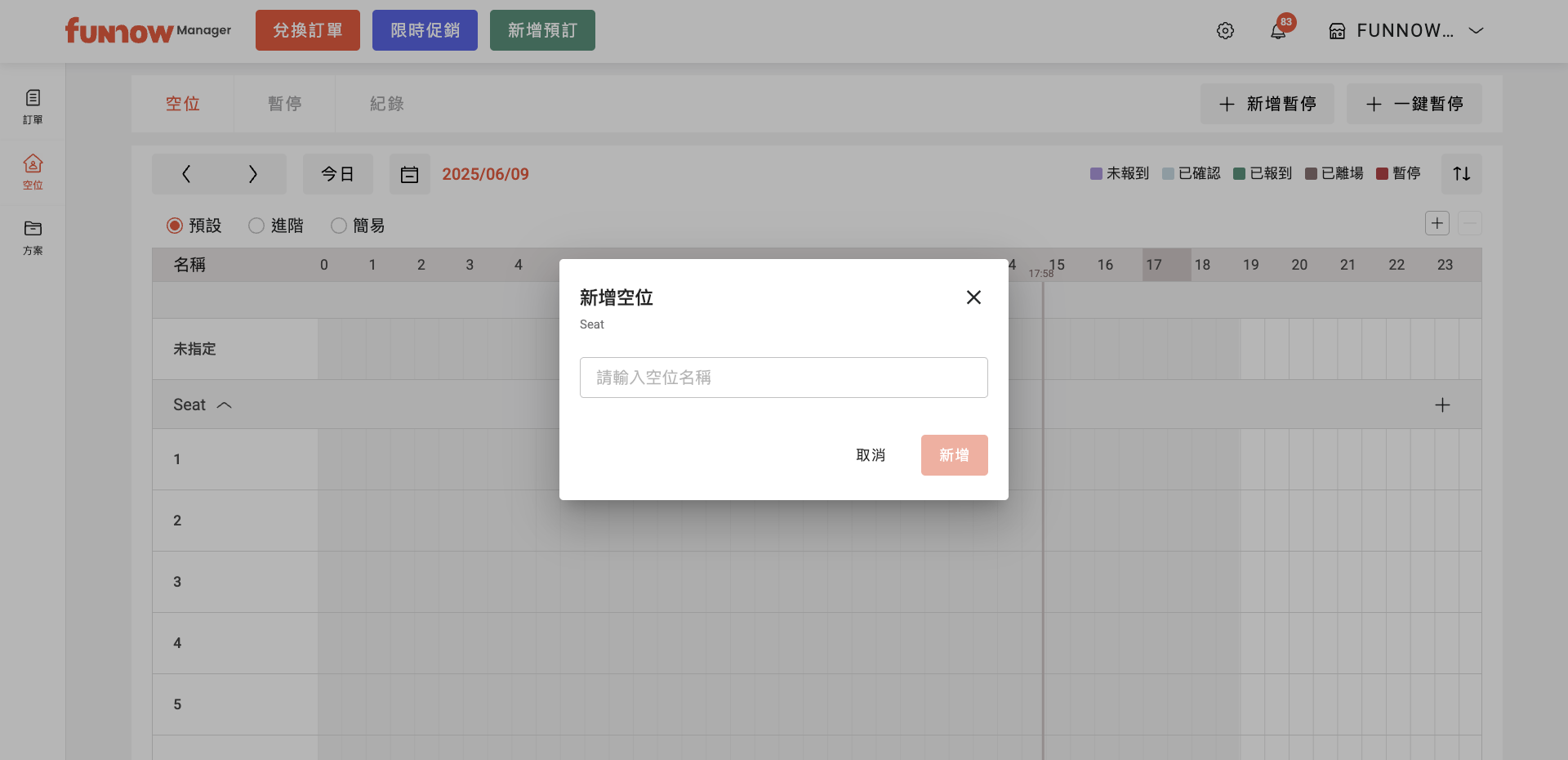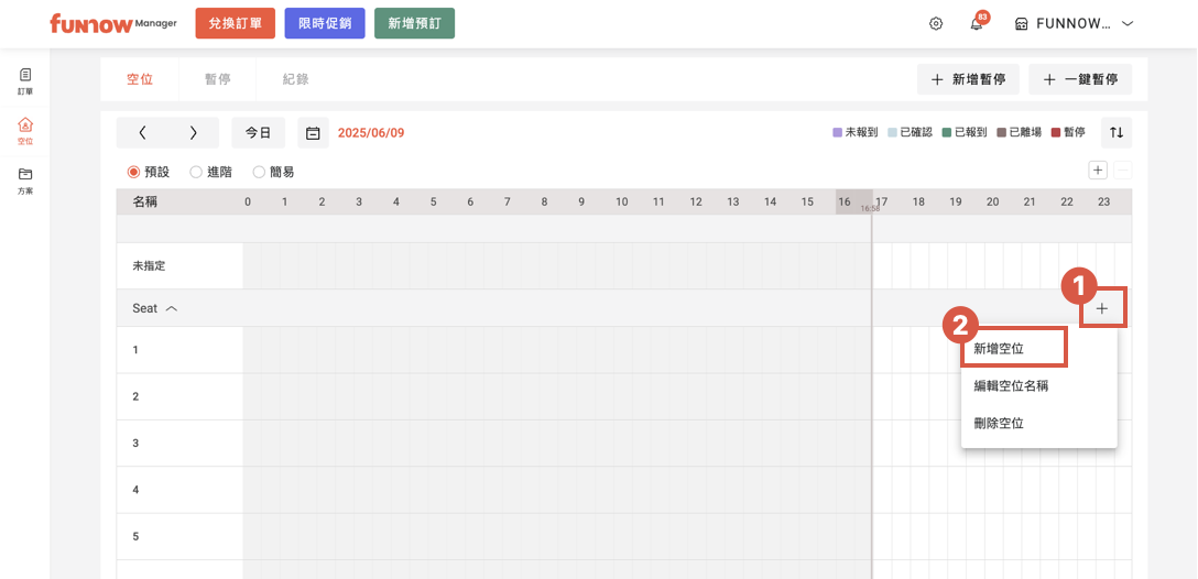 如何新增空位? 2026年02月03日 06:48 更新於 針對不同產業店家,空位條代表不同概念: 旅宿店家:一間空房餐廳店家:一個人頭座位FunNow Manager 針對餐廳店家,有另外提供桌位管理服務,可進入桌位管理頁面查看。美類店家:一位服務者(eg., 美甲師 1 號、按摩師傅 1 號) 1. 進入「空位」頁面2. 點選欲新增空位的空位群組右側的「+」按鈕3. 點擊「新增空位」 4. 請輸入欲新增空位的名稱。您可使用編號,或依實際需求命名,例如房型名稱或服務者姓名。輸入完成後,請點擊「新增」以儲存設定 相關文章 如何刪除空位? 如何調整 YC 設定? 無法提供預訂的空位該如何暫停? 如何利用「循環設定」設定常態販售價格? 如何移除 YC 時段?