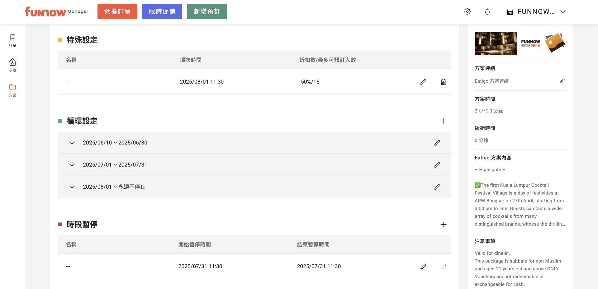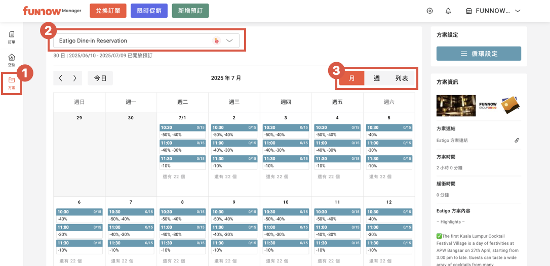 - 您可直接於時段上查看各時段的折扣數與已預訂人數,點擊時段即可展開該時段的詳細資訊