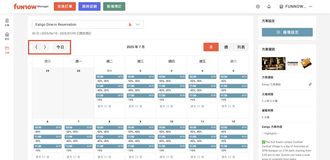 點擊箭頭按鈕可切換至上一月/週或下一月/週,點擊「今日」按鈕可快速回到當前月份/週次