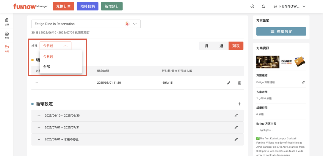 1. 於「方案」頁面右上方「方案列表」選擇欲查看的方案