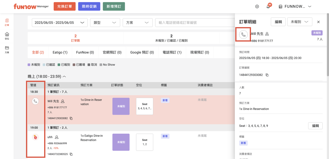 (電話預訂):店家自行新增的電話預約訂單