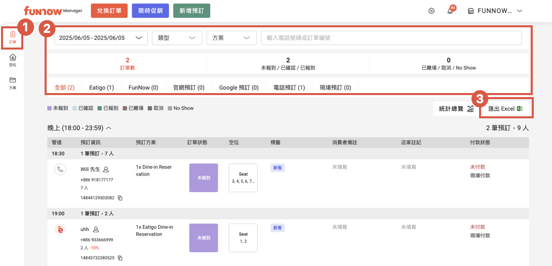 如何匯出訂單? 2026年02月10日 01:59 更新於 1. 進入「訂單」頁面2. 選擇欲匯出的訂單日期區間,或設定其他篩選條件3. 點擊頁面右側的「匯出 Excel」按鈕,即可匯出該日期內的所有訂單資料 相關文章 如何分辨訂單來源 ( 管道 )? 如何透過搜尋查看特定訂單? 如何使用訂單篩選器? 如何利用「特殊設定」設定特殊節日的方案價格? 可以不使用核銷碼核銷訂單嗎?