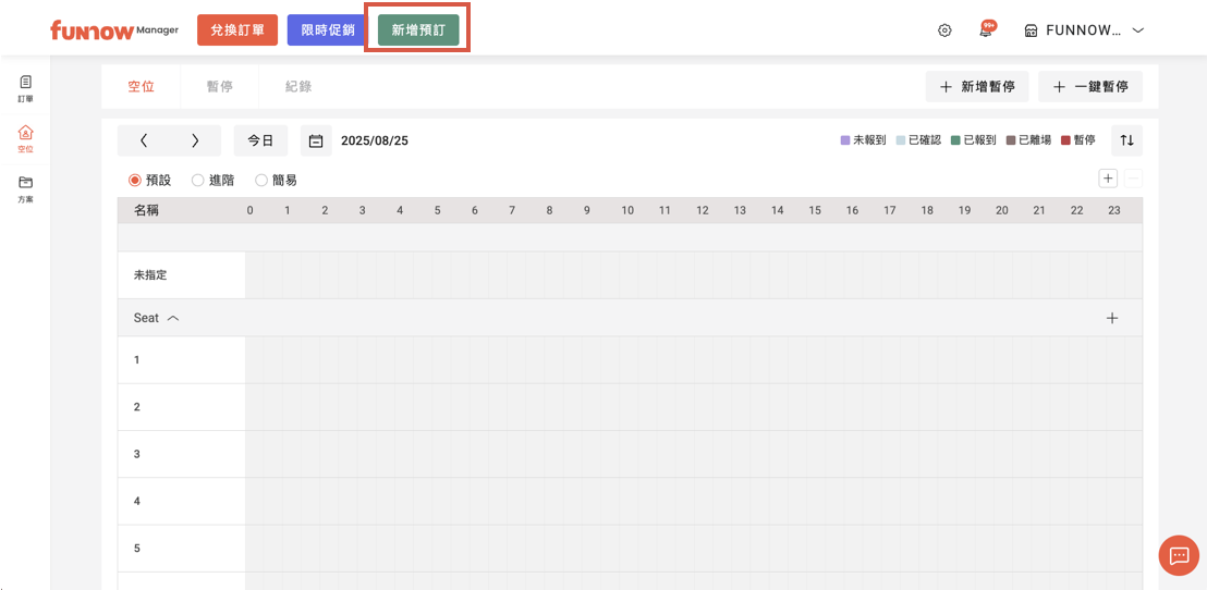 當消費者非透過您的官網預約連結預約時,您可使用「新增預訂」功能,將來自其他管道 ( 例如:電話或現場 Walk-in ) 的訂單手動建立於 FunNow Manager 中,方便您統一管理所有訂單。