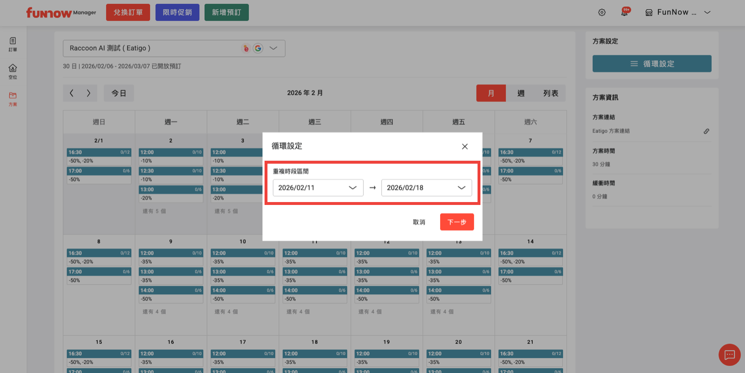 若原有 YC 折扣設定日期為 2/6 - 永遠不停止,而您想針對情人節週進行不一樣的 YC 折扣,則點選「開始日期」為 2026/2/11,「結束日期」為 2026/2/18,則 YC 的變更會套用於 2/11 至 2/18 共 8 天。