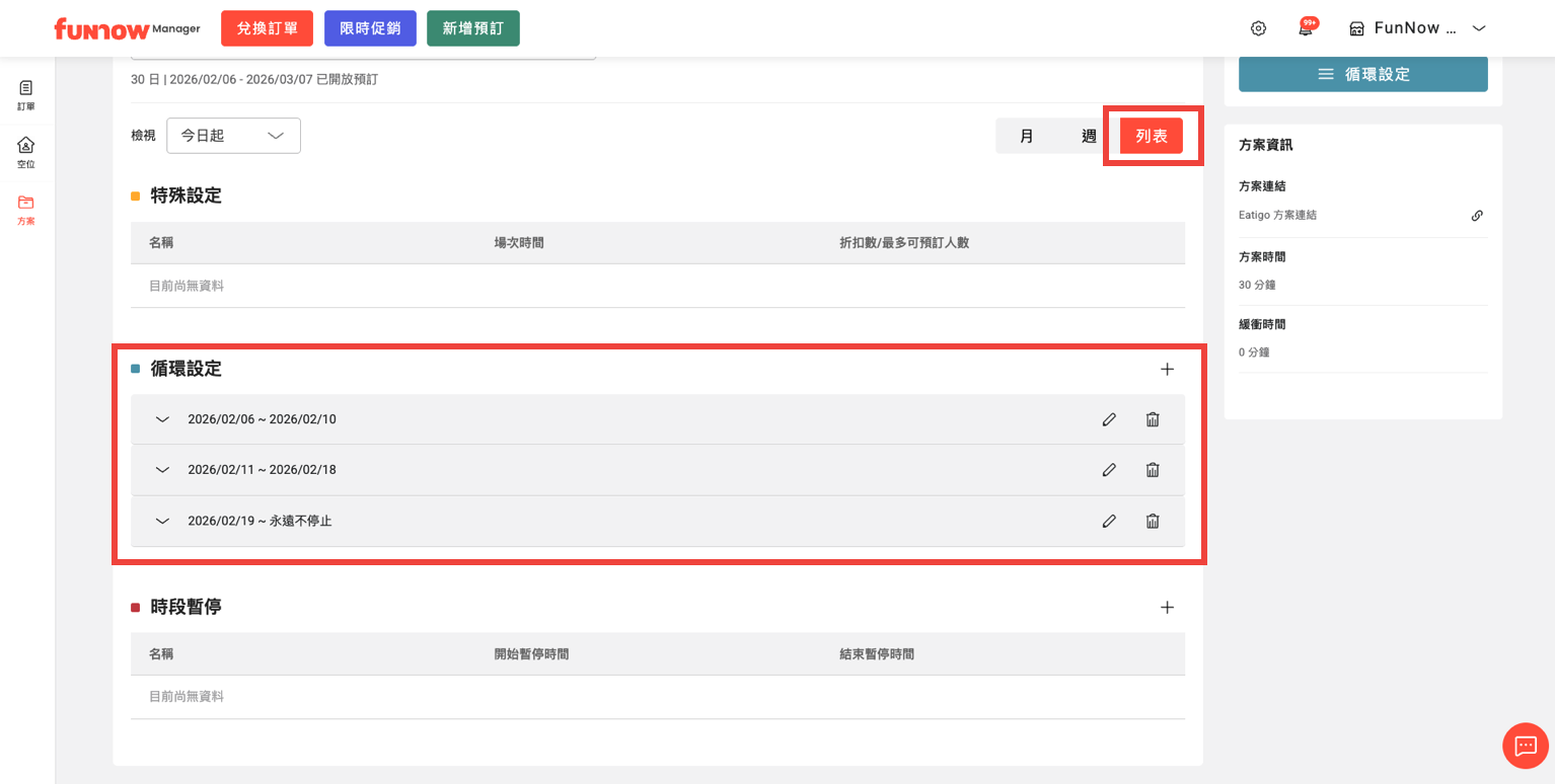 1. 於「方案」頁面右上方「方案列表」選擇欲進行設定的方案