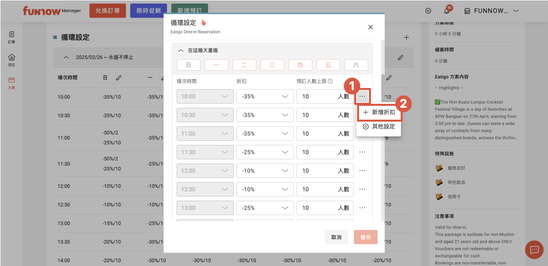 4. 您可以根據需求,調整現有時段的「折扣」及「預訂人數上限」