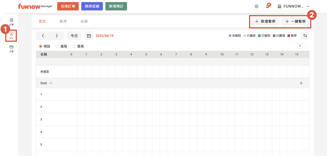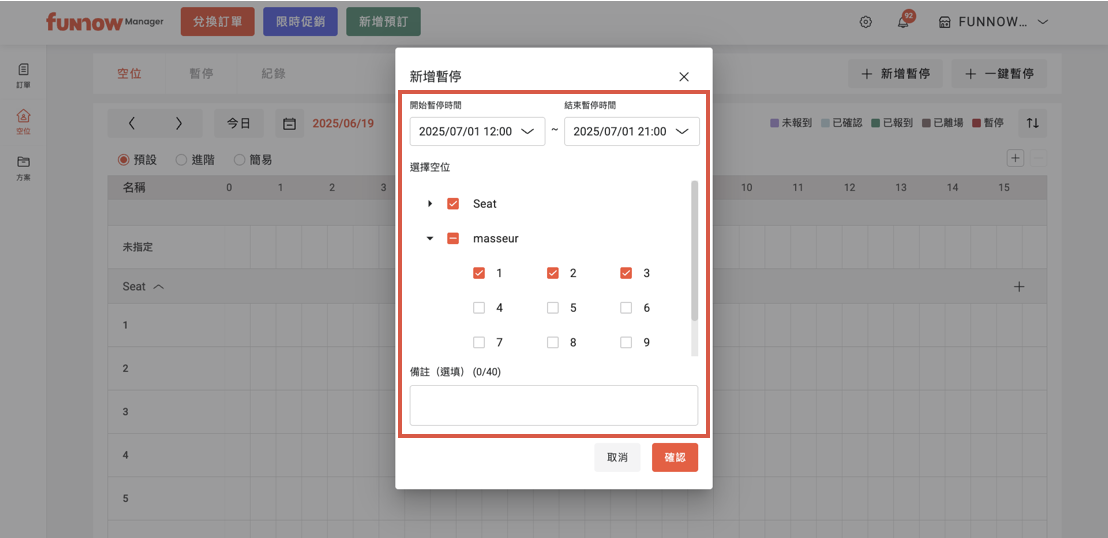 - 新增暫停:可彈性選擇欲暫停的時間區段及空位。