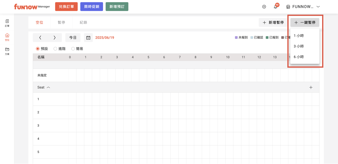 - 一鍵暫停:快速暫停整間分店的所有空位,時間選項為從現在起的 1 小時、3 小時、6 小時
